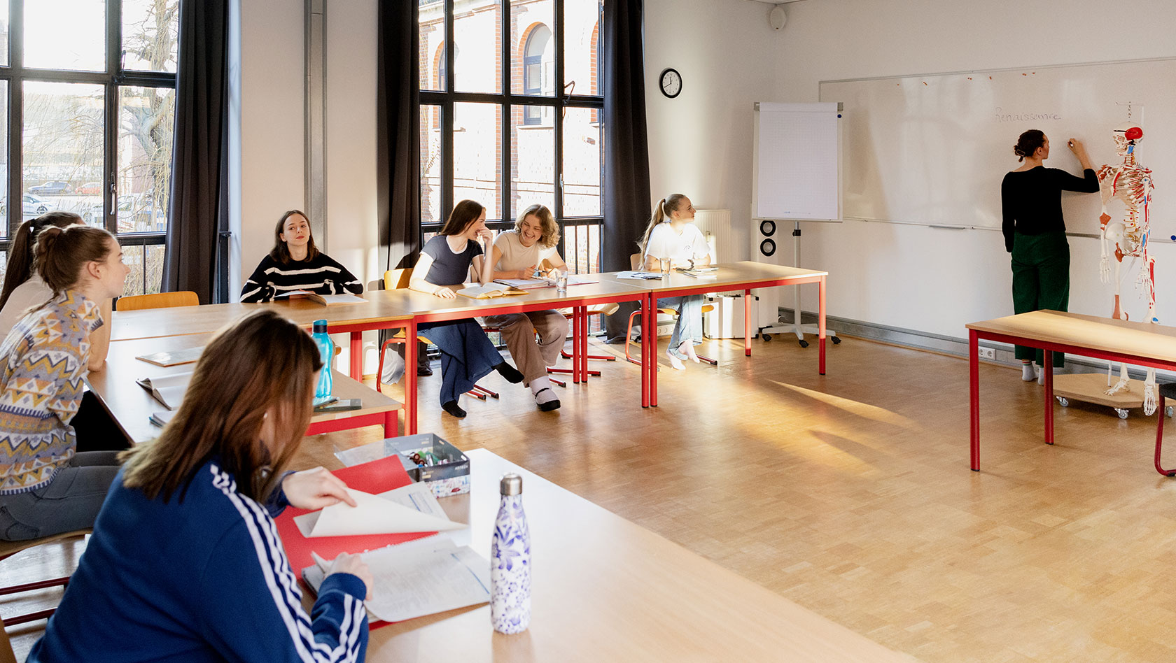 Unser Theorieraum ist ideal für Seminare und Weiterbildungen – ausgestattet mit Schreibtischen und Stühlen, Medientechnik, großem Monitor, Musikanlage, Whiteboard und Flipchart.
