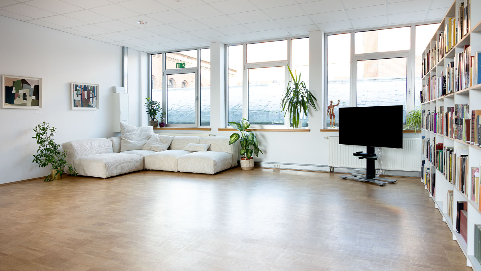 Unsere helle, freundliche Bibliothek mit Tanz-Fachliteratur lädt mit großer Couch und Schreibtisch zum Verweilen und Arbeiten ein.