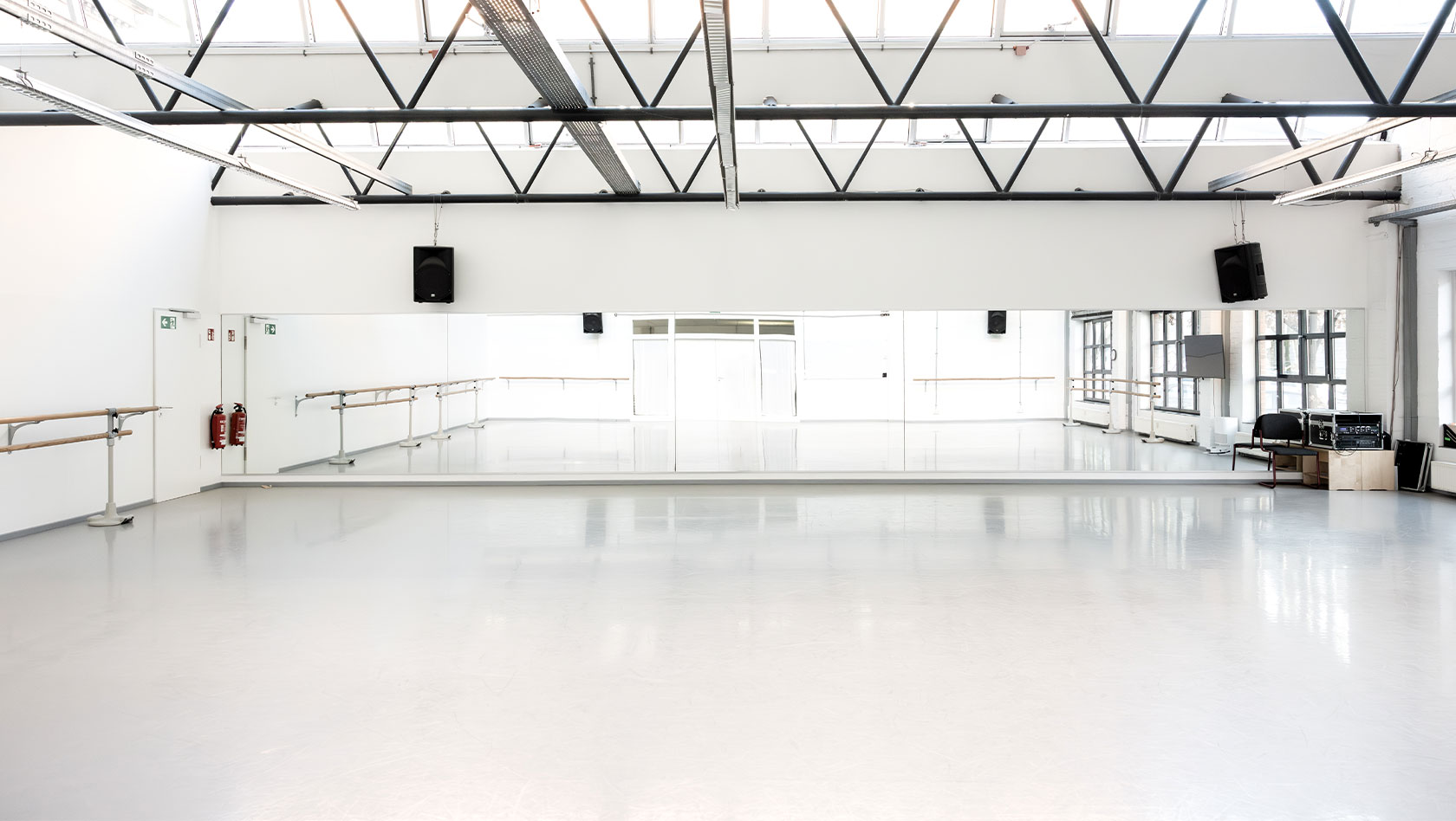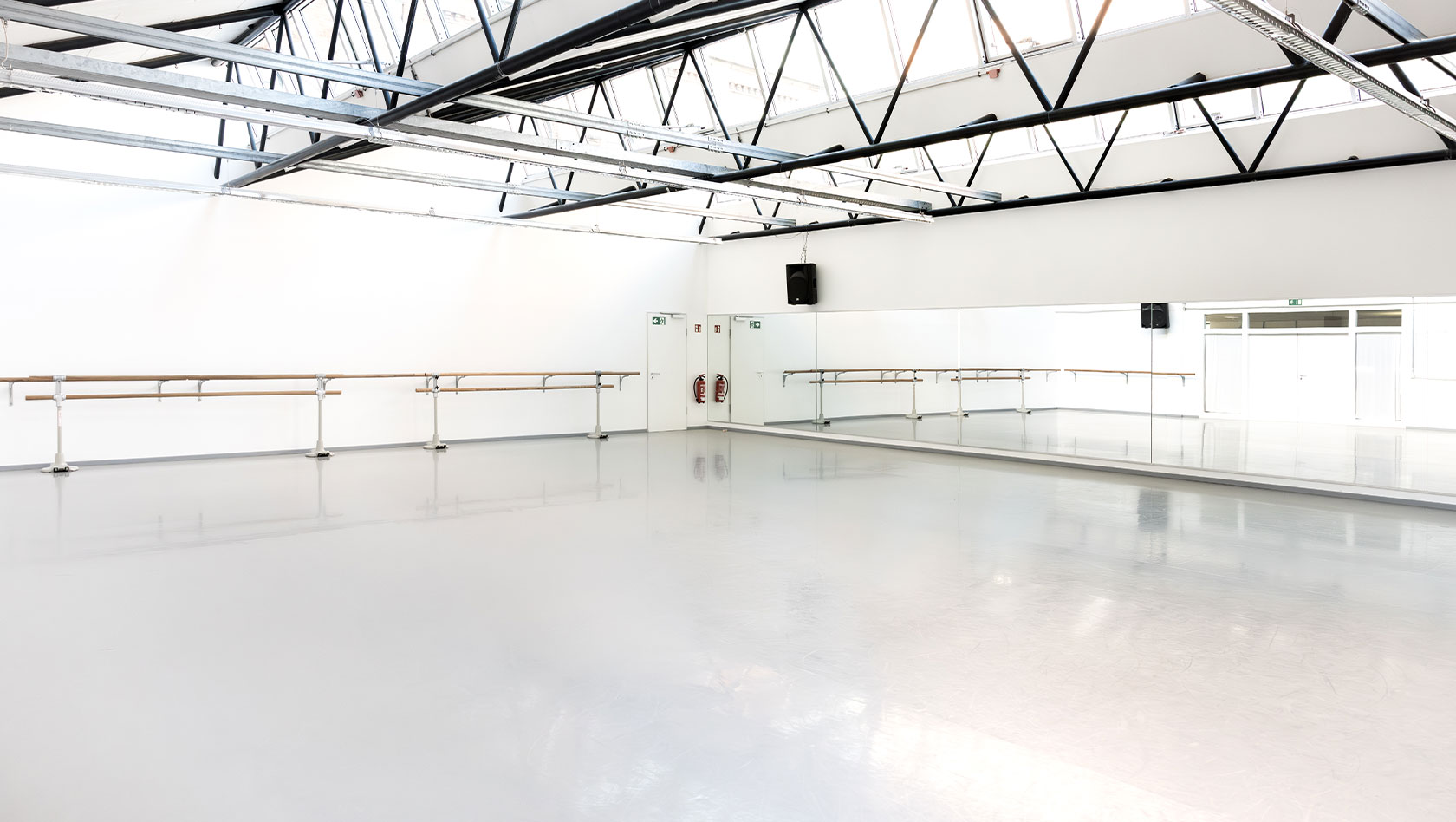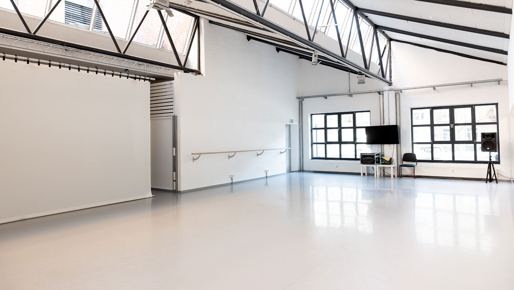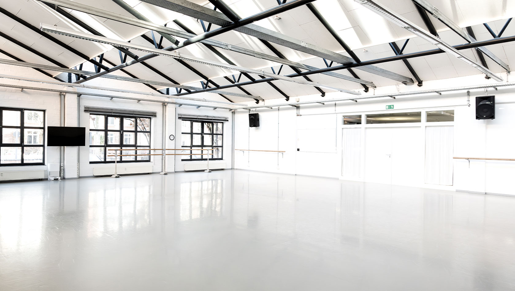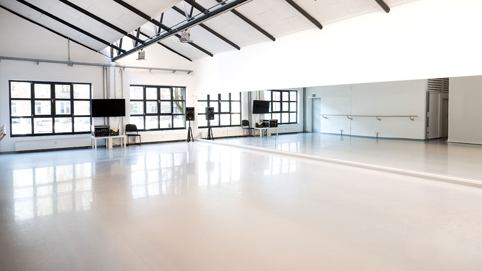 Lichtdurchfluteter, großzügig geschnittener Tanzsaal mit professioneller Ausstattung und hochwertigem Schwingboden.
